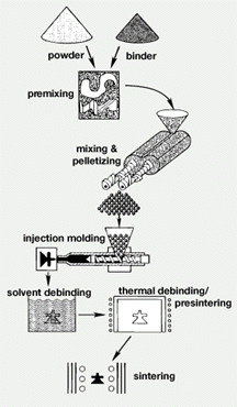 The process starts with premixing and kneading fine metal powders and thermoplastic binders.